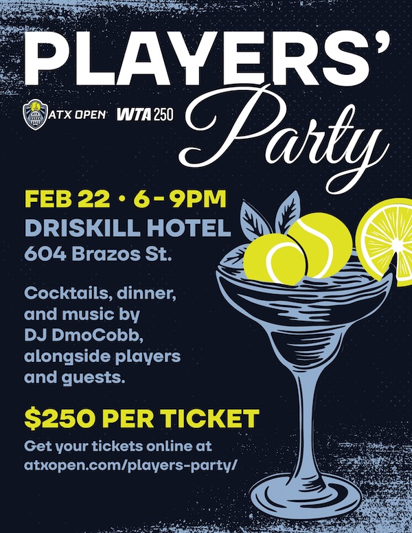 Kick off ATX Open week with a relaxed, social evening at The Driskill in downtown Austin. The Players’ Party brings together players, partners and fellow premium guests for cocktails, dinner and live music by DJ DmoCobb in an iconic Austin setting. It’s an opportunity to connect off the court and start the week in a way that reflects the energy of the city and the spirit of the tournament. Held the night before main draw play begins, the evening marks the start of ATX Open week off the court.